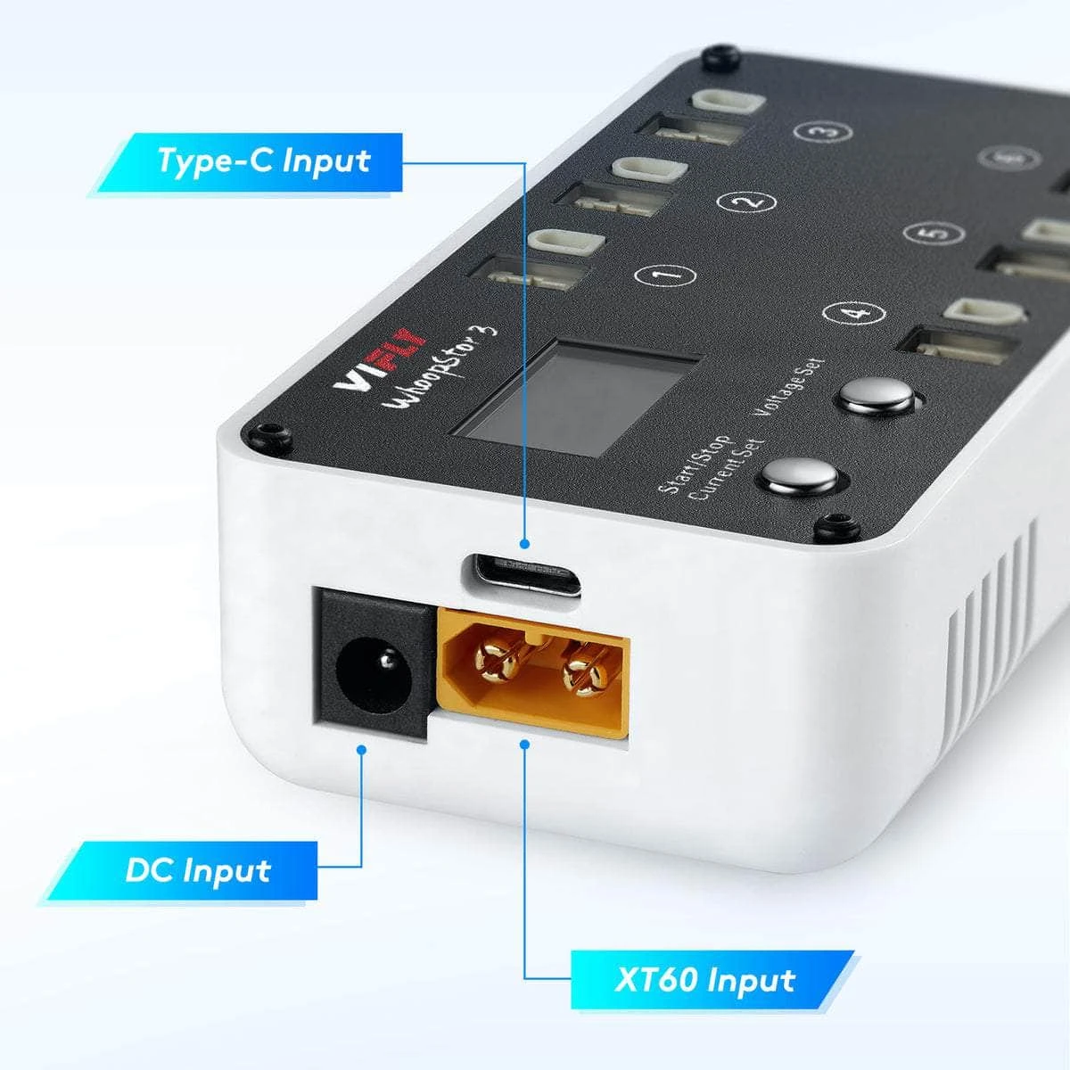 - 1x ViFly WhoopStor V3 1S LiPo/LiHV 6 Channel DC/USB-C Battery Charger & Discharger for BT2.0 & PH2.0