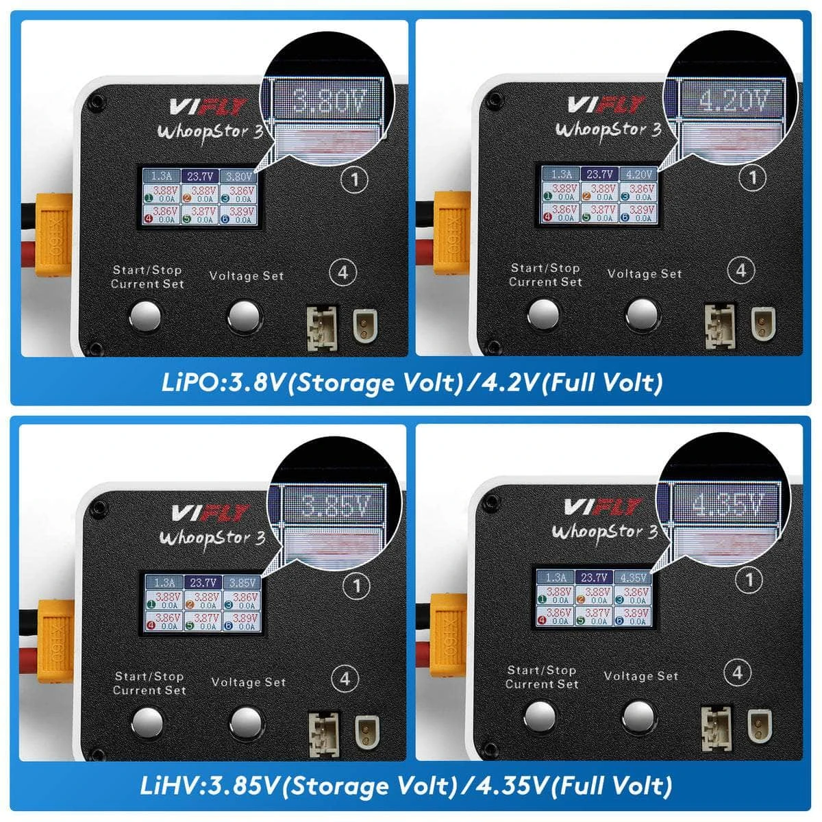- [Storage Charger and Discharger] VIFLY WhoopStor 3 is the first 1S LiPo charger with storage function. It includes both charging and discharging functions. Just select your target voltage, it will do it for you automatically.